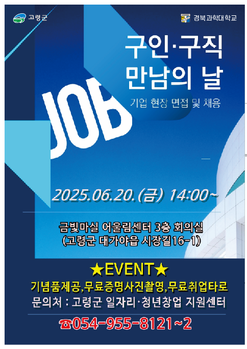 아래와 같이 『제1차 고령군 구인·구직 만남의 날』 행사를 개최하여 찾아가는 취업지원 서비스를 제공하고자 하오니, 관심있는 주민 및 기업들의 많은 참여 바랍니다. 1. 일시 : 2025. 6. 20.(금) 14:00 2. 장소 : 금빛마실 어울림센터 3층(대가야읍 시장길 16-1) *소규모 취업박람회 형태로 진행 3. 참석대상 : 구인업체 5개소 정도 / 구직자 30명 정도 4. 주요내용 - 구인기업-구직자 맞춤형 현장면접 및 채용기회 제공 - 구직자에게 일자리 정보 제공 - 증명사진 촬영 - 참석자에게 소정의 기념품 제공 5. 참고사항 : 맞춤형 취업알선을 위하여 사전접수 권장 6. 문의사항 : 고령군 일자리·청년창업지원센터 ☎054-955-8121,8122