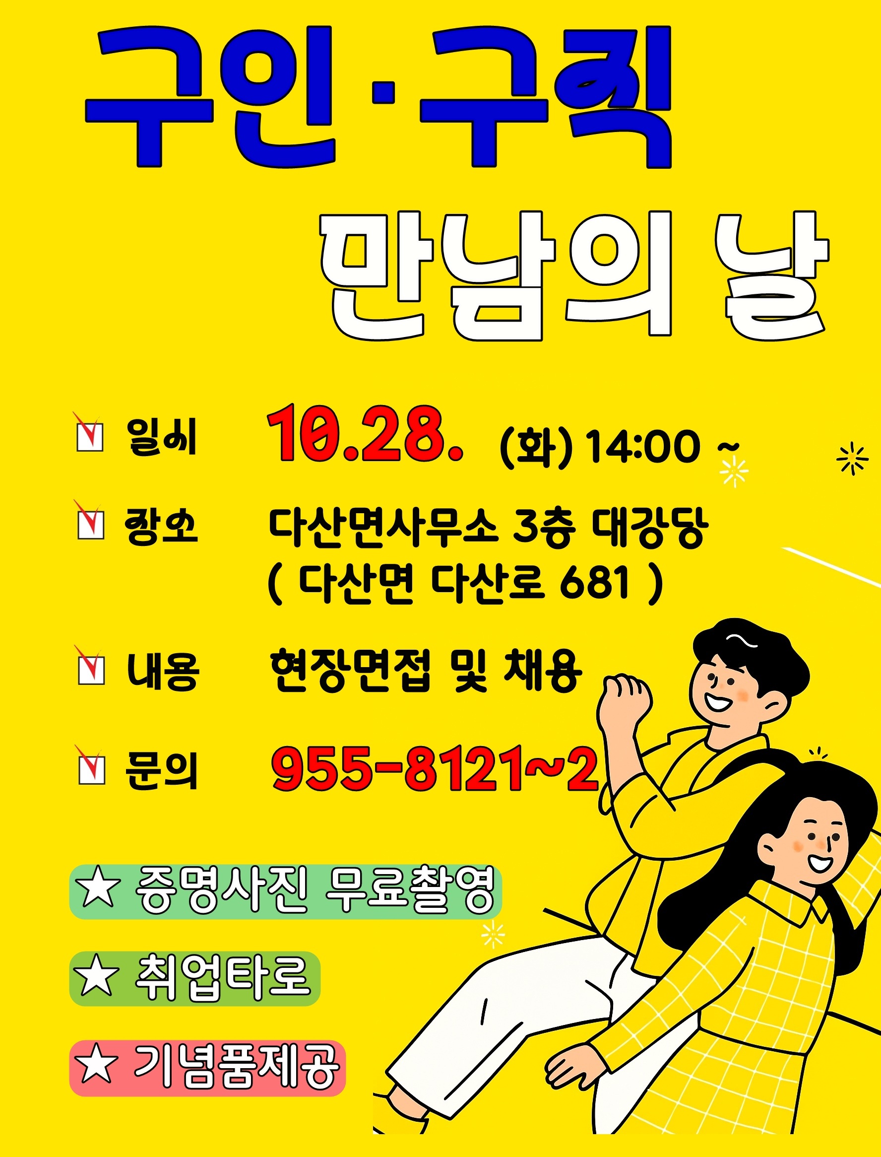 「고령군 일자리·청년창업지원센터」에서는 지역의 구인-구직 일자리 미스매치 현상을 해소하고 지역 내 활력을 촉진하고자 아래와 같이 『제2차 고령군 구인·구직 만남의 날』 행사를 개최하여 찾아가는 취업지원 서비스를 제공하고자 하오니, 관심있는 주민 및 기업들의 많은 참여 바랍니다. 1. 일시 : 2025. 10. 28.(화) 14:00 2. 장소 : 다산행정복합타운 3층 강당(다산면 다산로 681) *소규모 취업박람회 형태로 진행 3. 참석대상 : 구인업체 5개소 정도 / 구직자 30명 정도 4. 주요내용 - 구인기업-구직자 맞춤형 현장면접 및 채용기회 제공 - 구직자에게 일자리 정보 제공 - 증명사진 촬영 - 참석자에게 소정의 기념품 제공 5. 참고사항 : 맞춤형 취업알선을 위하여 사전접수 권장 6. 문의사항 : 고령군 일자리·청년창업지원센터 ☎054-955-8121,8122